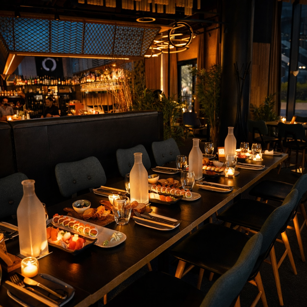 Seisva vastuvõtu vormis mahutame kuni 130 külalist, pakkudes kas hõrke kanapeesid või rikkalikku buffeed. Istumiseks on 60-kohaline baariala, avatud köögis einestamisvõimalus kuni 32 inimesele ning kahes eratoas – Light Tatami ja Dark Tatami – on kummaski ruumi kuni 12 külalisele.